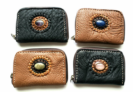 Handmade genuine pebble grain leather zipper wallet with precious stone accent