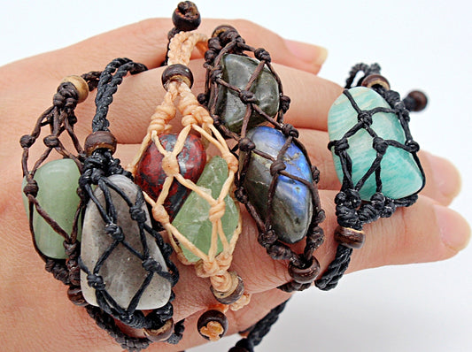 Handmade interchangeable macramé cage bracelet with tumbled stone