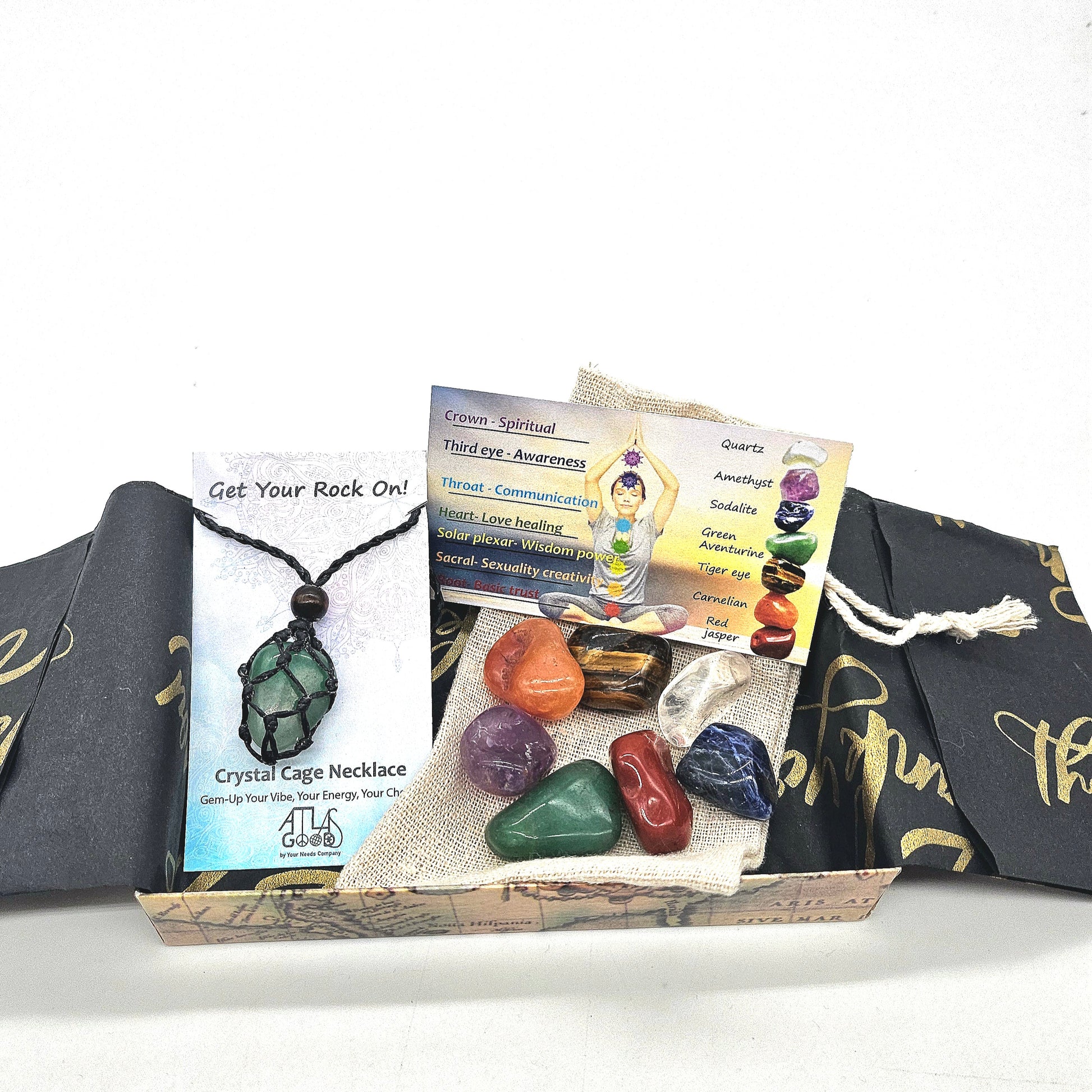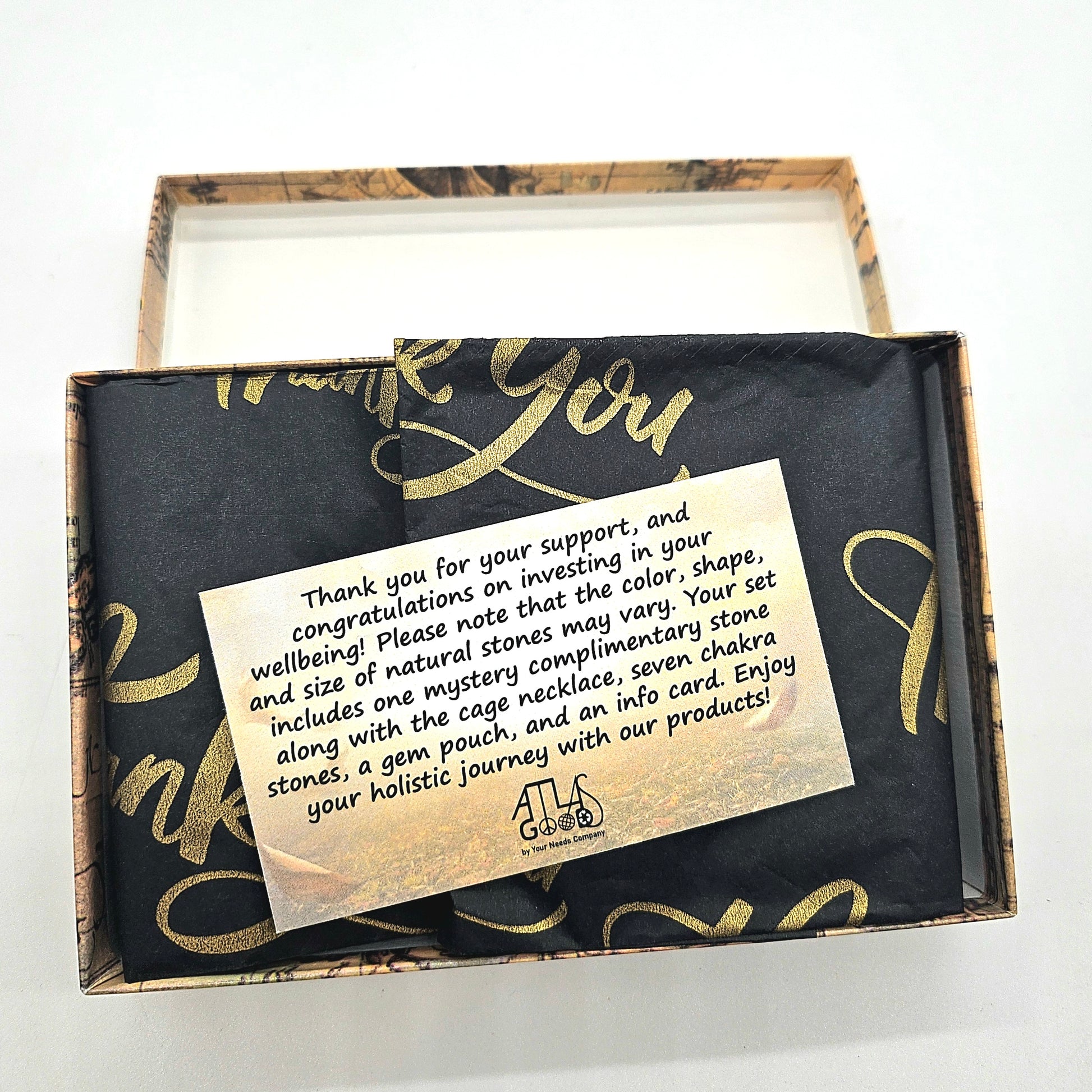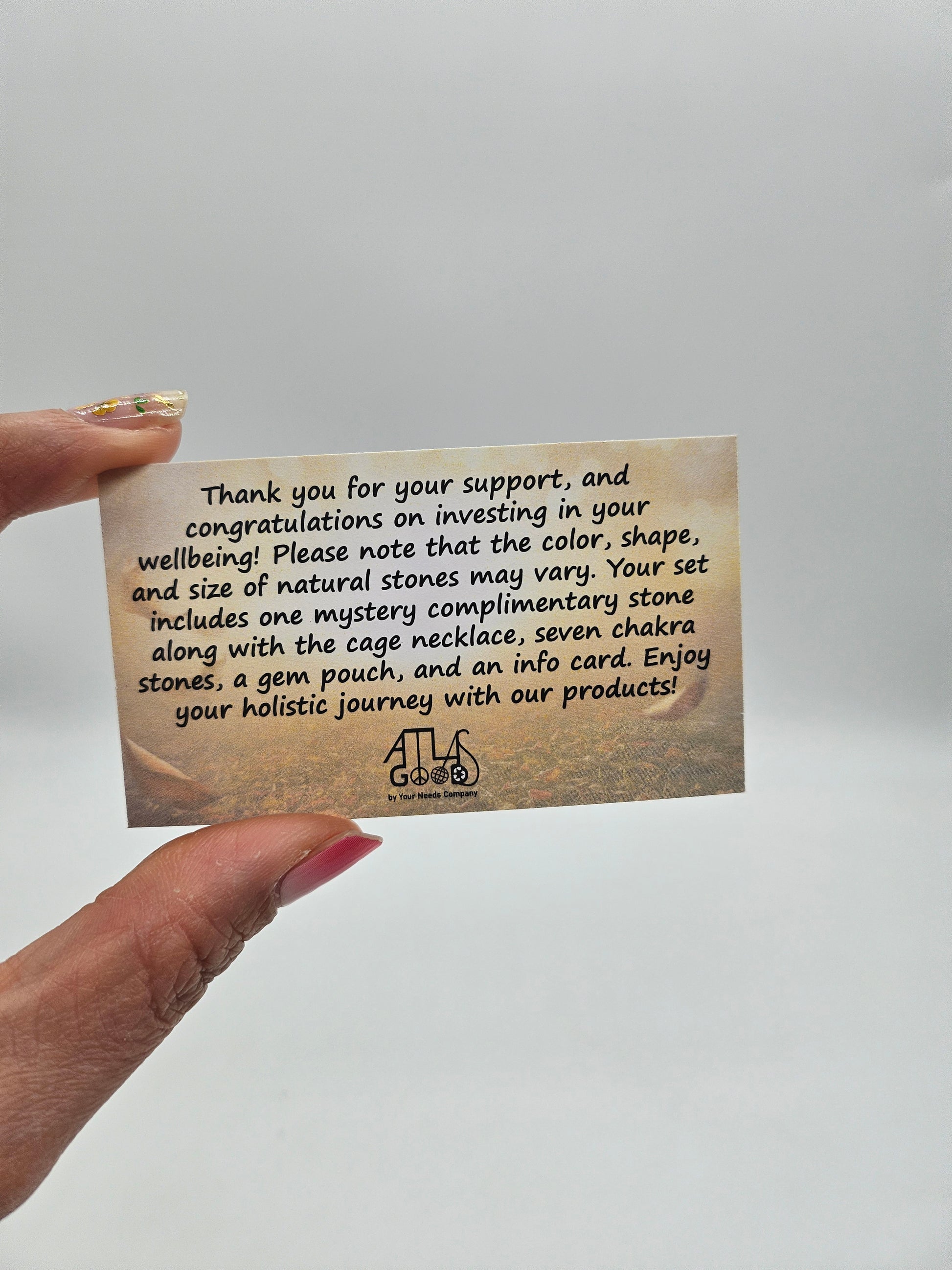 Please note that natural stones' color, shape, and size may vary. Your set includes one complimentary mystery stone, the cage necklace, seven chakra stones, a gem pouch, and an info card. Enjoy your holistic journey with our products!
