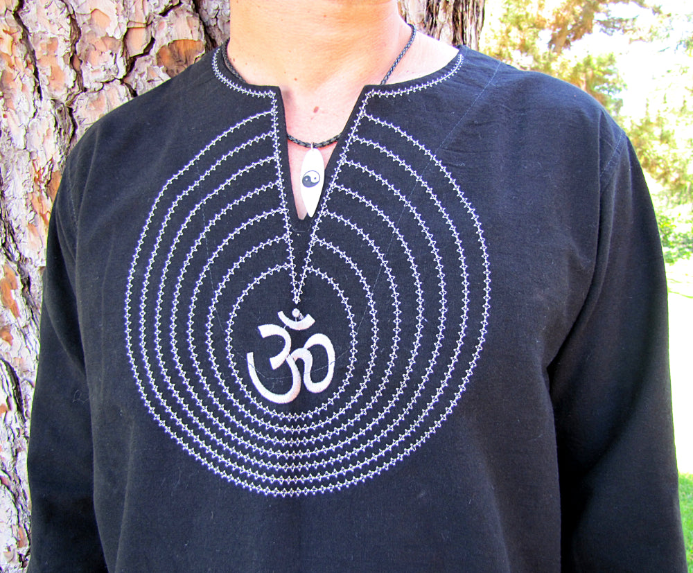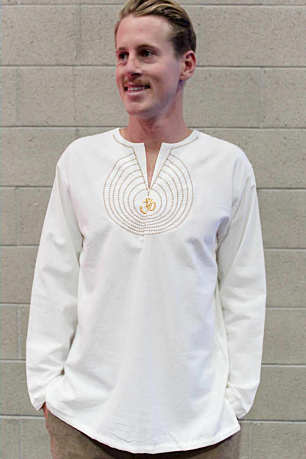Men's shirt white chinese collar long sleeve with om embroidery / Beach wedding/ Yoga/ Renaissance Medieval