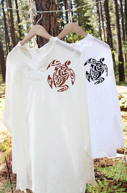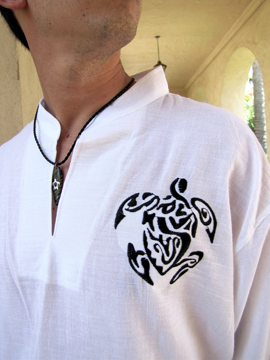 Men's shirt white chinese collar with celtic turtle embroidery / Beach wedding/ Yoga/ Renaissance Medieval