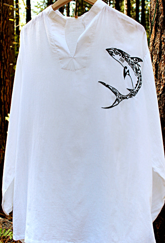 Men's shirt white chinese collar long sleeve with celtic shark embroidery/ Beach wedding/ Yoga/ Renaissance Medieval