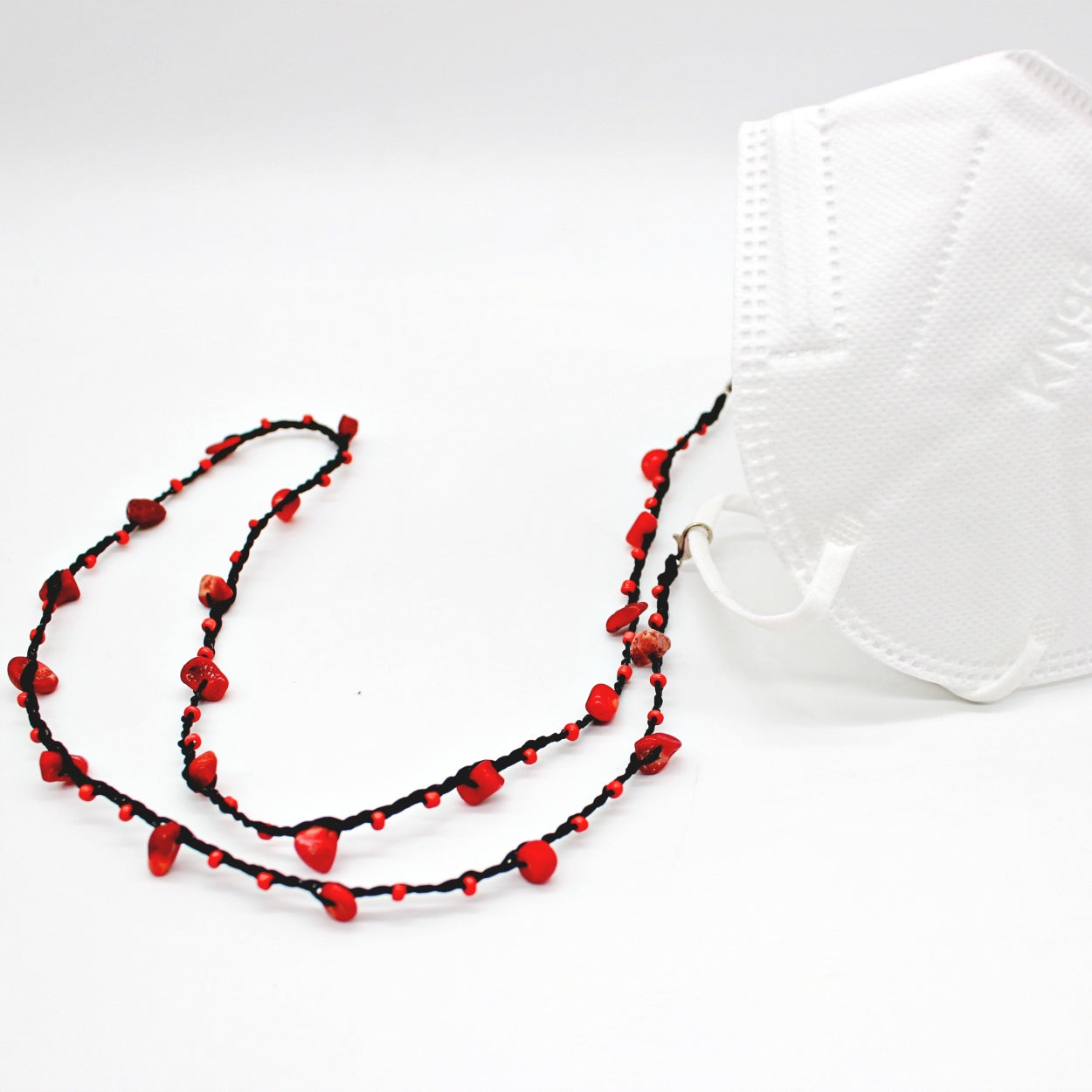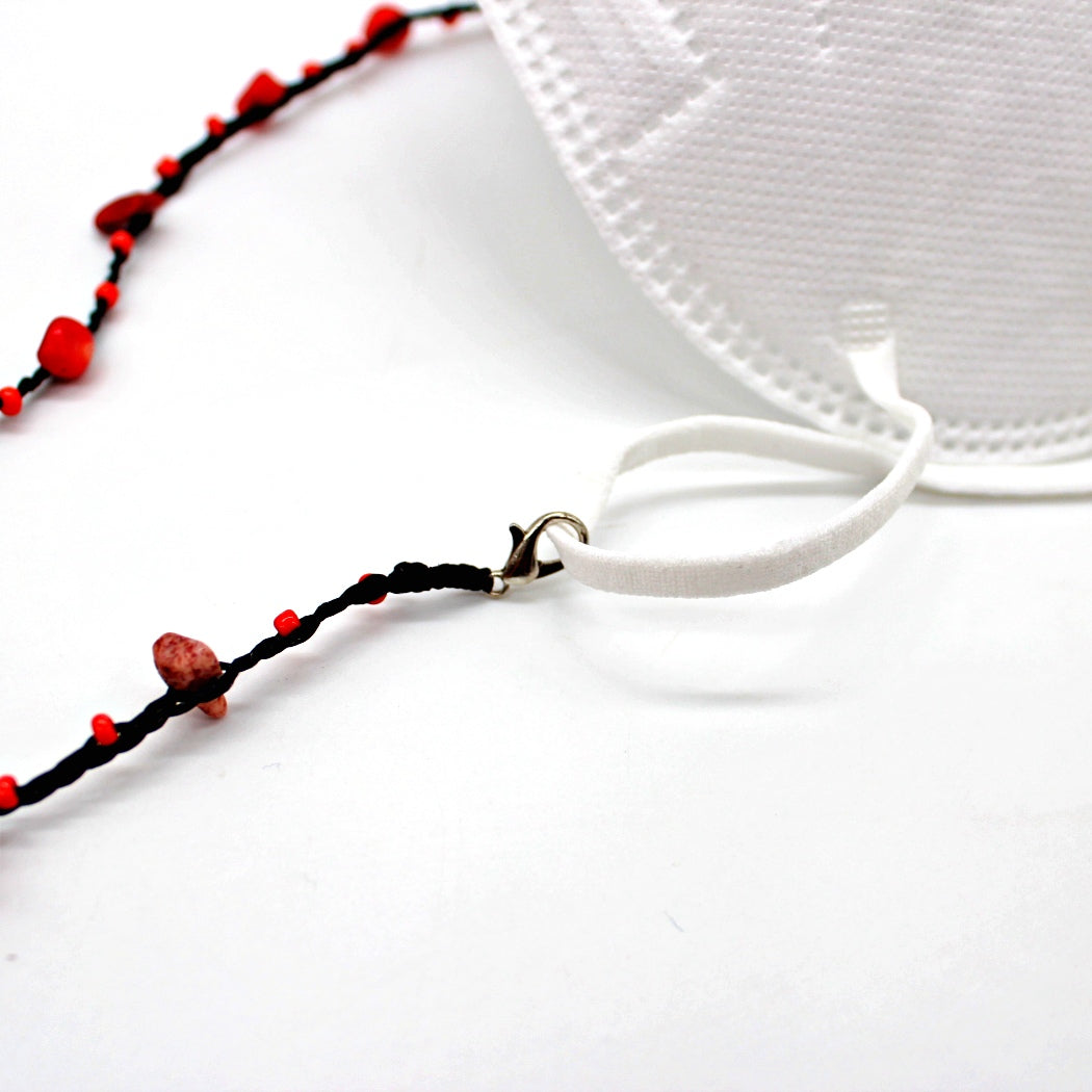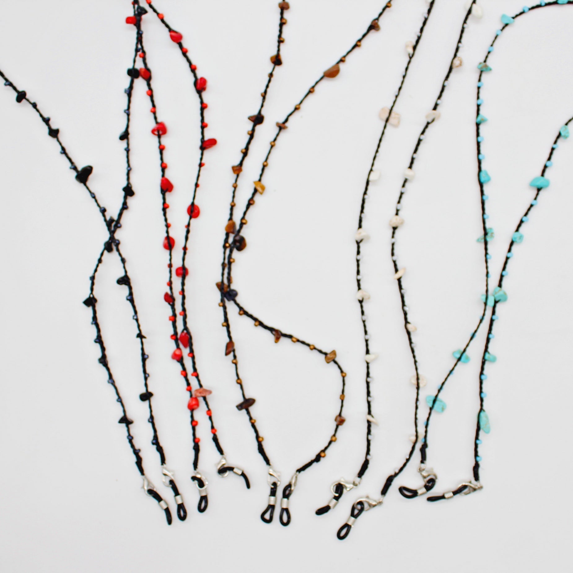 Each holder features a strand of intricately beaded small stones, creating a unique and eye-catching design. The ends are equipped with a lobster claw closure to securely attach to face mask straps, as well as rubber loops for holding eyeglasses and sunglasses.